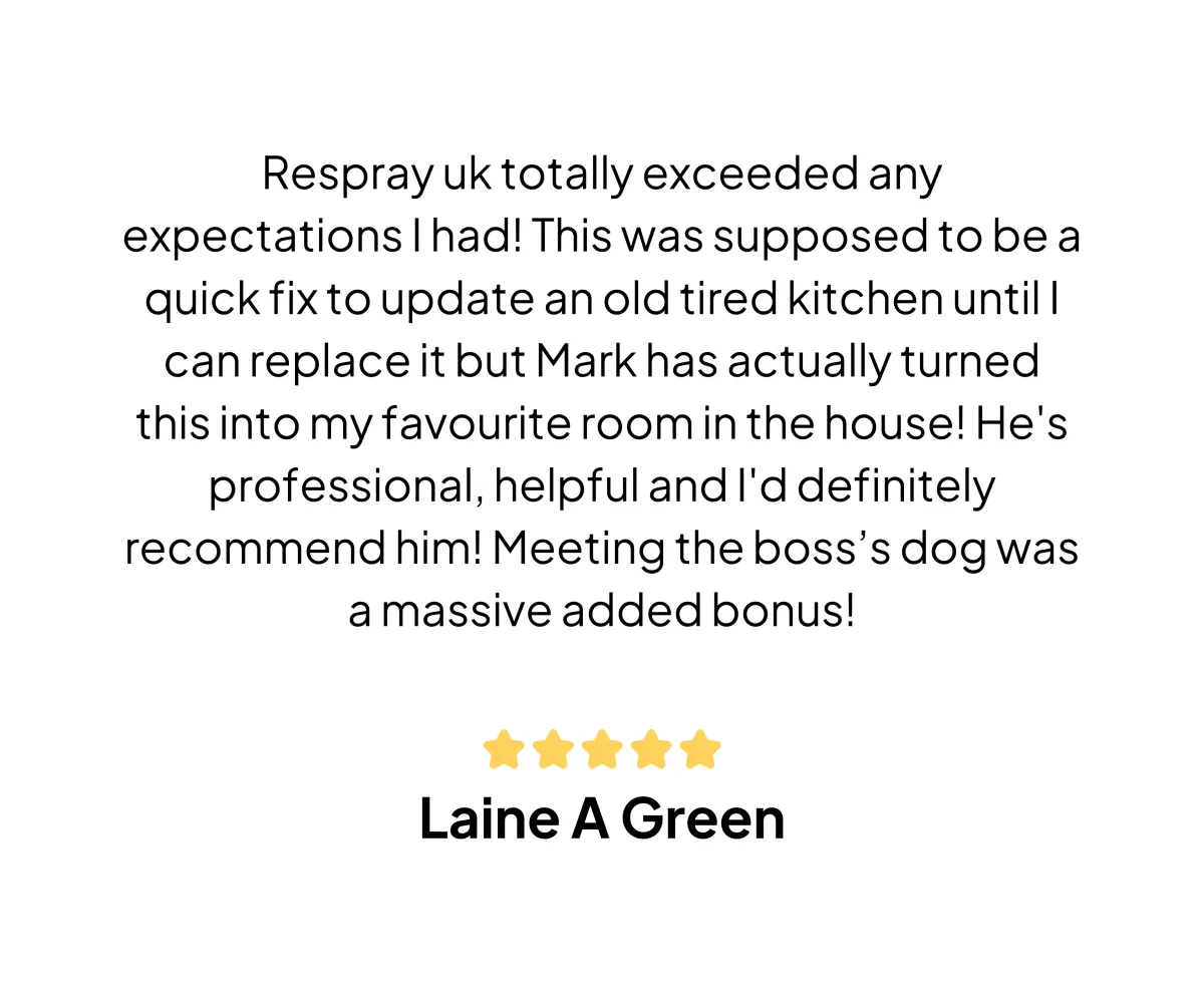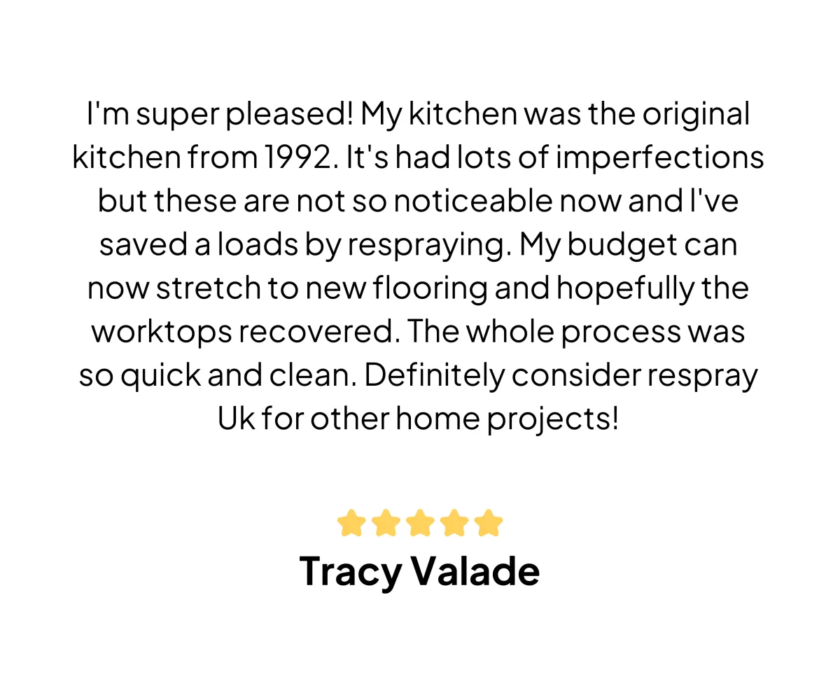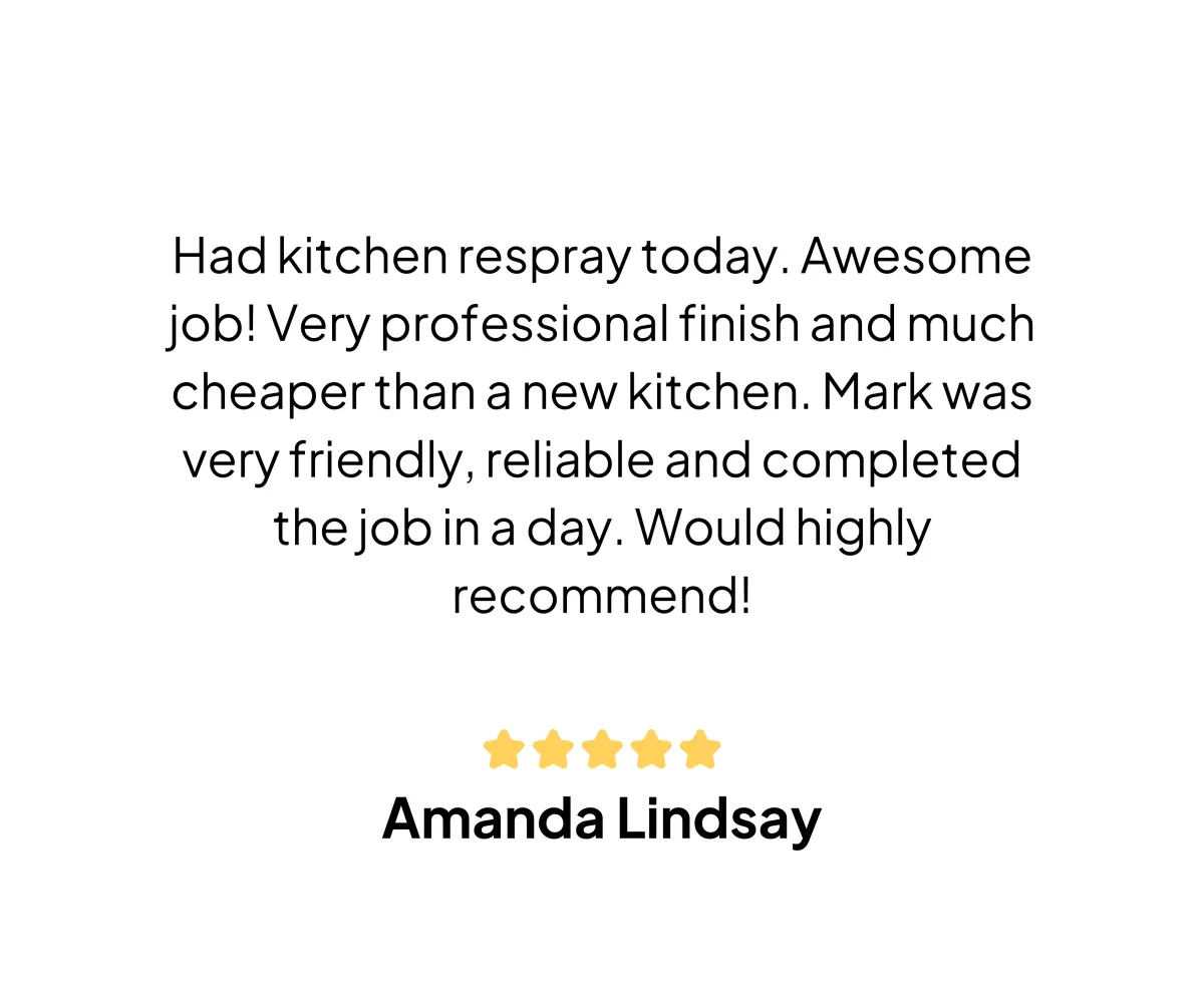 When properly maintained, a kitchen respray can last for many years. The durability of the respray depends on factors like the quality of materials and the care you take in using and cleaning your kitchen. We also offer a 15 year written warranty document on request