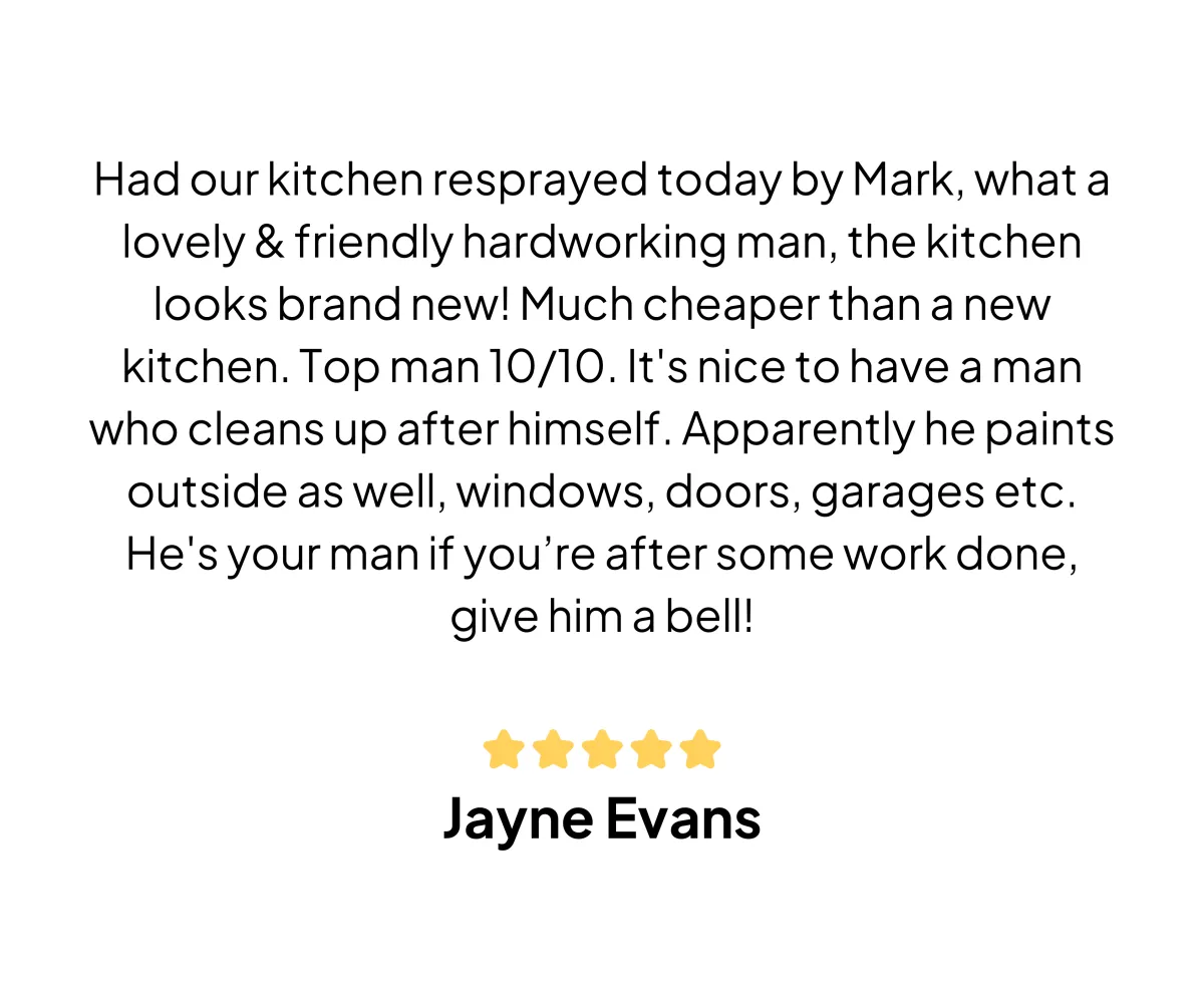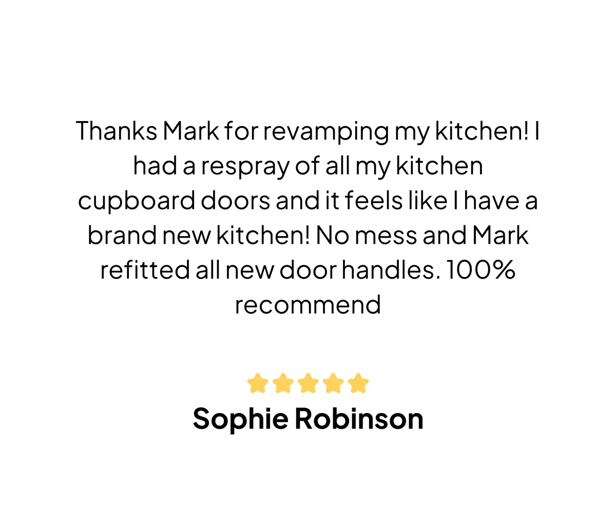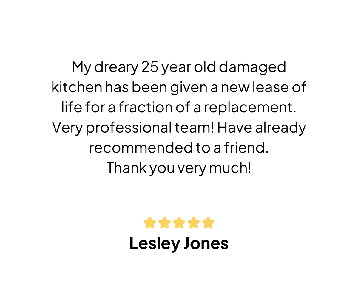 When properly maintained, a kitchen respray can last for many years. The durability of the respray depends on factors like the quality of materials and the care you take in using and cleaning your kitchen. We also offer a 15 year written warranty document on request